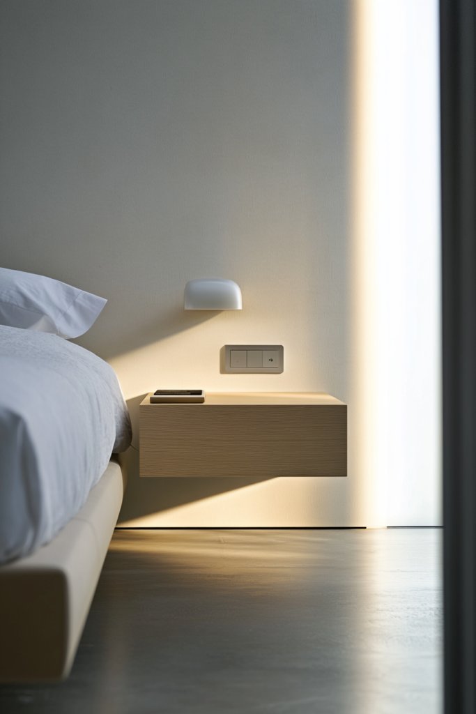 Imagine a wall with two slim, floating wooden panels, each perfectly aligned with your mattress. The smooth, matte finish of the wood complements your bedding, creating a seamless, modern aesthetic. Small LED strip lights subtly illuminate the space beneath, highlighting the floating effect. A soft glow from the sconces on either side adds ambiance, while a minimalist clock and a favorite book sit neatly on the surface, free of clutter. It’s a calming, organized space that feels both functional and stylish.