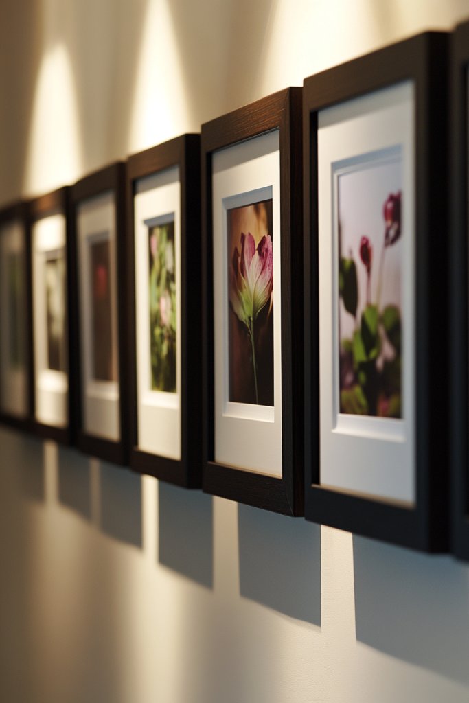 Picture a series of identical wooden frames, finished in matte black, white, or natural wood, arranged symmetrically or in a curated asymmetrical layout. Inside each frame, you have your favorite photos, botanical prints, or abstract art—each carefully chosen to tell your story. The frames are mounted flush against the wall, creating a clean, cohesive look. Soft lighting accentuates the gallery, making it a focal point in your room. The overall effect is sophisticated and inviting.