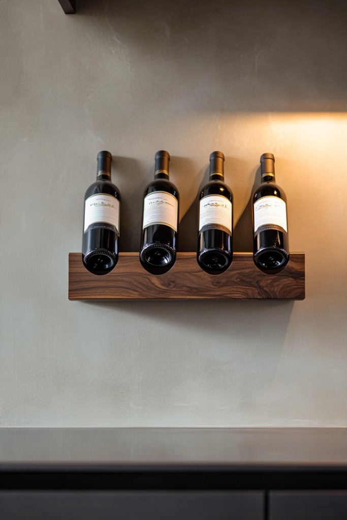 Visualize a slim, horizontal wooden shelf with evenly spaced slots or cubbies for bottles. The wood’s rich grain and warm finish contrast beautifully with the cool glass bottles and metallic labels. The rack is mounted at eye level on your wall, creating a focal point in your kitchen or bar area. Soft lighting above or nearby highlights the bottles, making your collection look curated and inviting. It’s both functional for pouring and artistic for display.