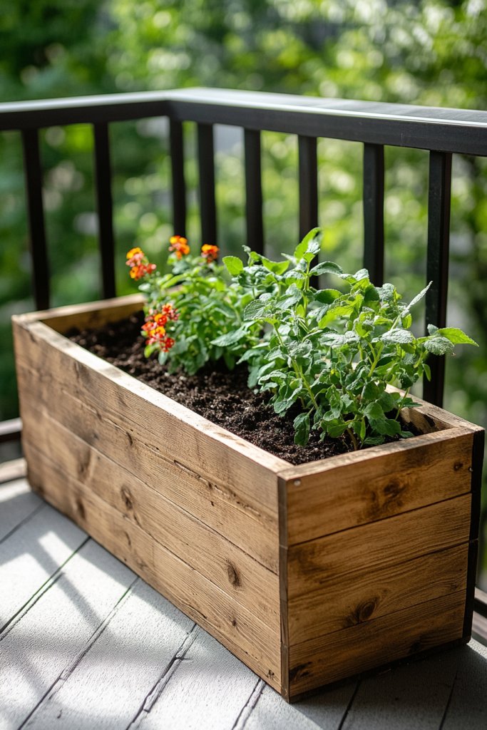 Picture a rectangular wooden box with clean, simple lines and a weatherproof finish. Filled with vibrant blooms or fresh herbs, it sits on your patio or balcony, adding color and life. The wood’s natural texture complements outdoor decor, while drainage holes ensure healthy roots. A cozy outdoor nook is complete with these planters, especially when paired with outdoor lighting or seating nearby. It’s a welcoming retreat that’s both functional and beautiful.