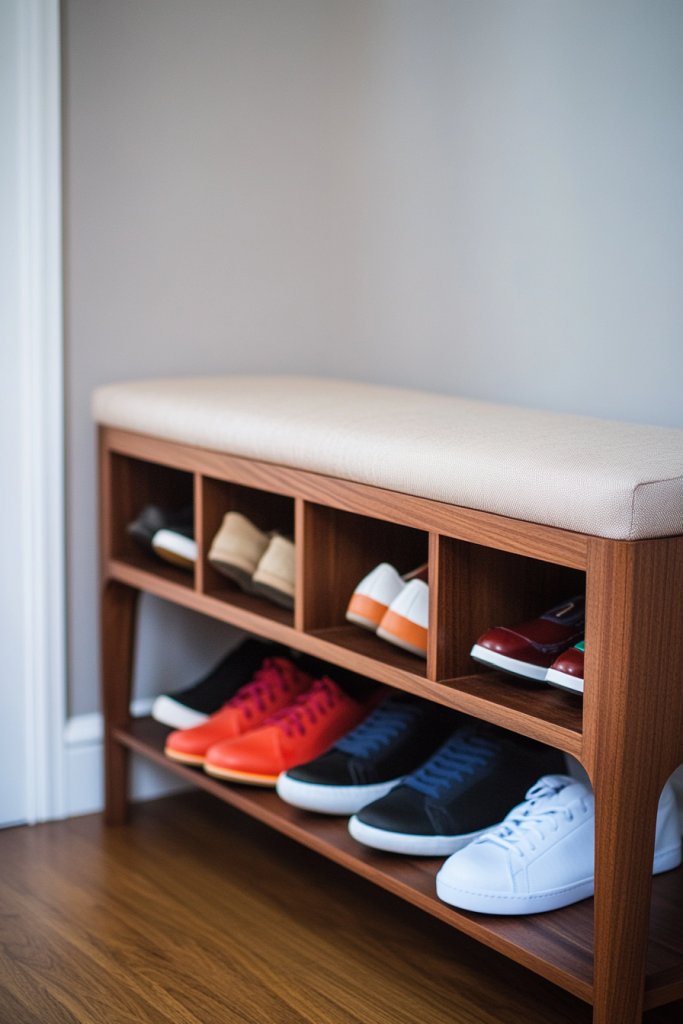 Imagine a sturdy wooden bench with a smooth finish, topped with a soft cushion for sitting. Beneath, open cubbies hold shoes of all sizes, neatly arranged and easy to access. The bench fits snugly into your entryway, with hooks on the wall above for coats and bags. The warm tones of the wood contrast with colorful sneakers and boots, creating a lively yet organized space. It’s as if your shoes finally got the VIP treatment.