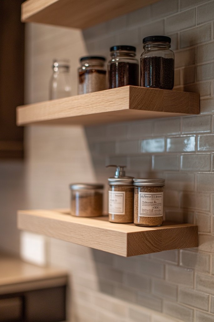 Picture a set of sleek, open shelves made from light-colored wood, mounted securely on the wall. They hold neatly arranged jars, towels, or decorative containers, all within easy reach. The shelves are minimalist but sturdy, with smooth edges and a natural finish that highlights the wood grain. Soft lighting underneath adds warmth and ambiance. It’s a perfect blend of practicality and aesthetic appeal, transforming your space into a magazine-worthy room.