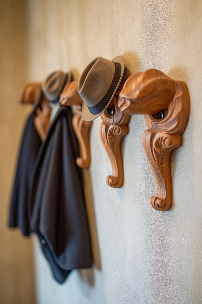 Imagine a sculptural wooden hook carved into an abstract shape or a whimsical animal figure. It’s mounted on a feature wall, instantly catching the eye. Coats, hats, or bags hang from these artistic pieces, adding a playful or sophisticated vibe depending on your style. The natural wood textures contrast beautifully with painted walls, creating a focal point that’s both practical and eye-catching. It’s a small detail with a big impact.
