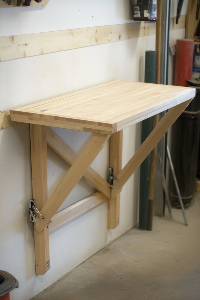 Picture a robust wooden workbench with a thick, smooth top that folds down against the wall. When upright, it provides a stable surface for projects, with built-in storage underneath for tools and supplies. The frame is reinforced with metal brackets for strength, and the fold mechanism is smooth and easy to operate. When folded up, the entire unit becomes a sleek wall panel, reclaiming your space. This clever design blends practicality with a clean aesthetic.