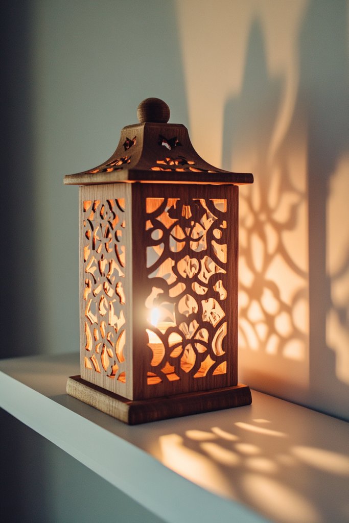 Imagine a handcrafted wooden lantern with intricate cut-out patterns, casting flickering shadows across your walls. The warm hue of natural wood complements candles of all shapes and sizes, from tall pillar candles to small tea lights. When lit, the lantern’s design creates a dance of light and shadow, transforming your space into a cozy retreat. These pieces look charming on mantels, tables, or shelves, adding rustic elegance to any room.