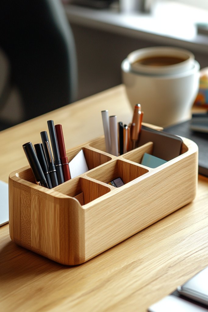 Picture a sleek wooden tray with multiple compartments, each designed for pens, paper clips, sticky notes, and other essentials. The dividers are adjustable or removable, allowing customization. The warm wood finish adds a touch of elegance to your desk, while the tidy compartments keep everything accessible. When your supplies are neatly organized, your desk looks inviting and professional, inspiring you to work better and faster.