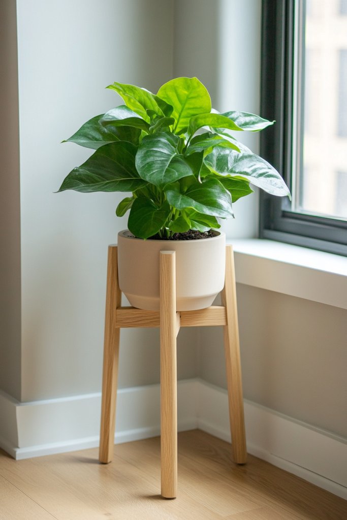 Visualize a set of slender, powder-coated metal or light-colored wooden stands with clean lines and gentle curves. Your favorite leafy plant rests atop, its pot nestled in a geometric holder that complements the stand’s minimalist design. The stand’s height varies, creating visual interest and making your plants pop against the wall or corner. Soft sunlight filters through nearby windows, casting playful shadows on the stand’s sleek silhouette, emphasizing its modern simplicity.