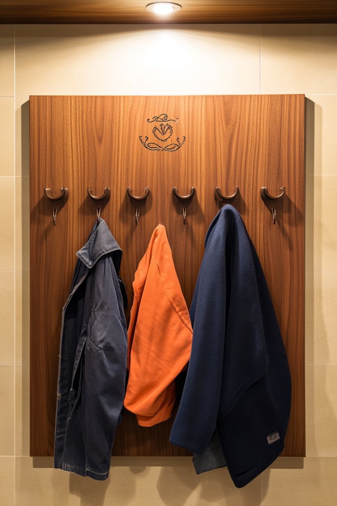 Picture a sleek wooden back panel, stained in rich walnut or painted in a bold color, mounted securely on the wall. Multiple hooks—metal or wood—are evenly spaced, each holding a coat, hat, or bag with ease. Small decorative accents, like engraved initials or carved motifs, add a custom touch. The overall look is polished yet inviting, making guests feel at home immediately. Soft lighting above highlights the craftsmanship and adds warmth.