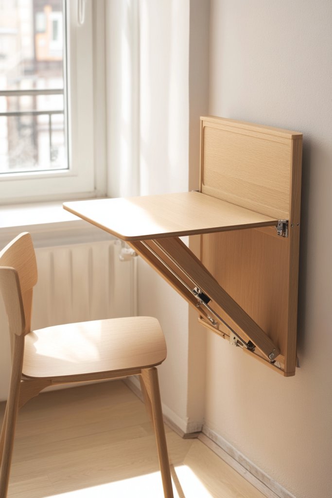 Imagine a sleek, lightweight wooden desk with foldable legs, finished in a natural or painted tone to match your decor. It rests neatly against the wall or slides under your bed, ready to be pulled out when needed. When unfolded, it provides a sturdy surface with enough room for your laptop, a notepad, and a cup of coffee. Its simple, minimalist design blends seamlessly into your living space, ready to support your work or hobbies.