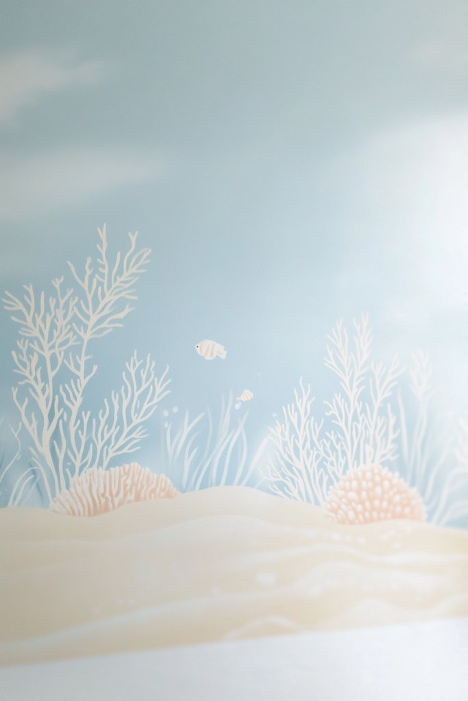 Imagine a sprawling wall featuring soft waves, delicate seashells, and gentle underwater scenes in hues of baby blue and sandy beige. The mural’s textures mimic gentle ripples, inviting a calming vibe. The subtle transitions between shades mimic the serenity of the sea at dawn, making the space feel endless and tranquil. It’s like bringing a piece of the ocean right into your nursery.