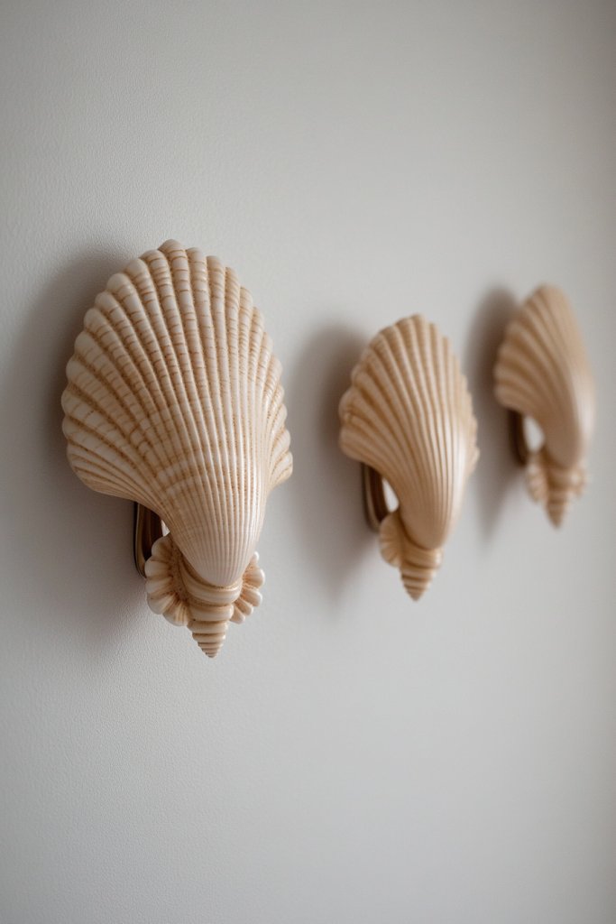 Picture decorative hooks shaped like seashells, starfish, or coral branching out along the wall. They’re made from wood, resin, or metal with textured finishes that mimic natural surfaces. These hooks not only serve a practical purpose but also act as decorative accents, creating a subtle shoreline scene. They add visual interest without clutter.