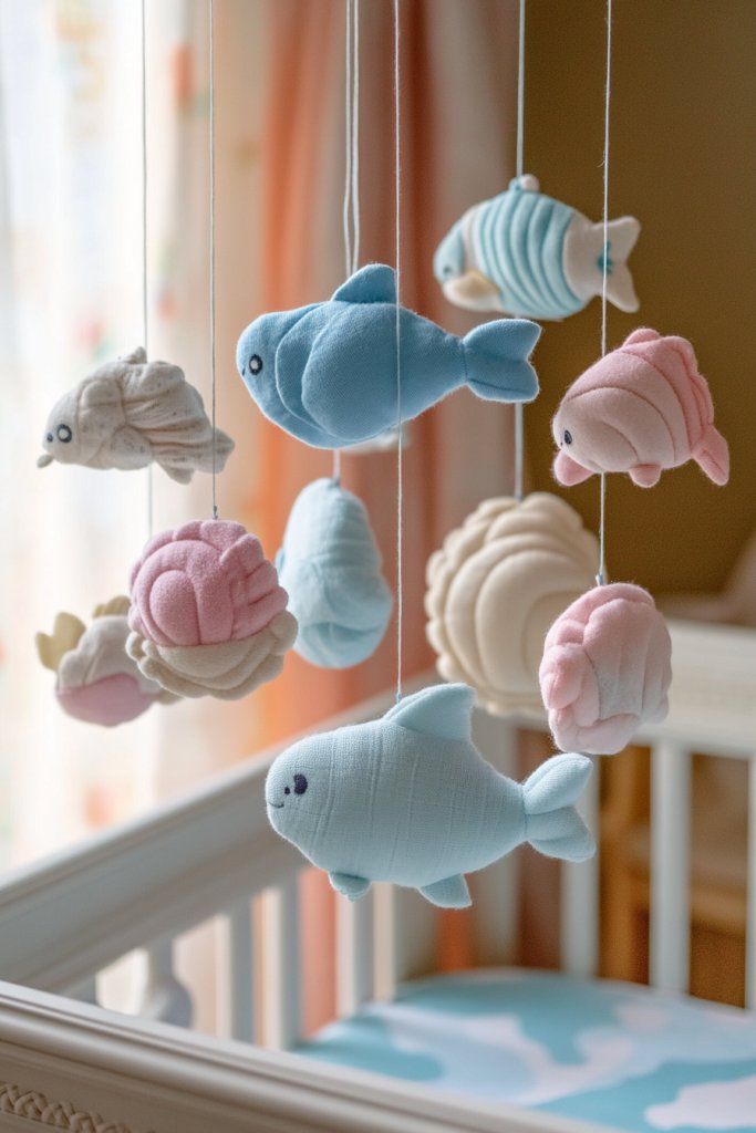 Looking for a gentle focal point above the crib that sparks curiosity without overstimulation? An underwater-themed mobile made with soft fabrics can create a soothing visual and auditory experience. It’s an easy way to entertain and calm your little one simultaneously. Plus, it adds a tactile element to the nursery.