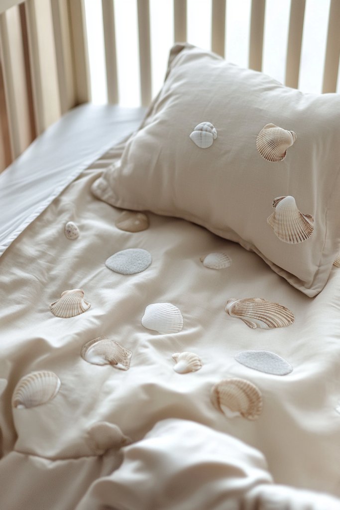 Searching for a subtle way to incorporate ocean elements into your nursery? Seashell and pebble motifs on crib bedding can provide just the right touch. It’s a delicate way to evoke the sea’s serenity without overwhelming the space. Plus, it’s a classic design that never goes out of style.
