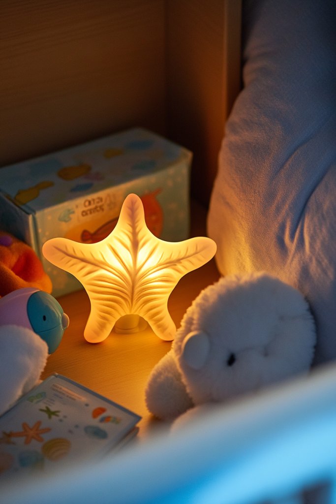 Imagine a night light shaped like a starfish, shell, or whale, casting a gentle, warm light across the room. Its soft glow mimics the peaceful ambiance of moonlit waters, helping your little one feel safe. The light’s subtle color tones—pale blue, soft pink, or creamy white—blend seamlessly with ocean-inspired decor. It’s both functional and decorative, adding a whimsical touch.