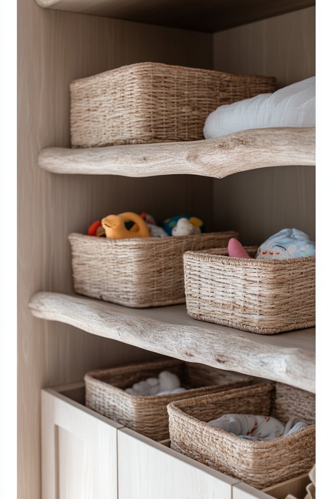 Picture baskets or bins crafted from textured, driftwood-look materials—think woven rattan, natural fibers, or painted wood. These containers sit neatly on shelves or the floor, holding everything from toys to diapers. Their weathered, organic appearance evokes the shoreline, adding a touch of nature to your nursery. They look both rustic and refined, perfect for a coastal vibe.